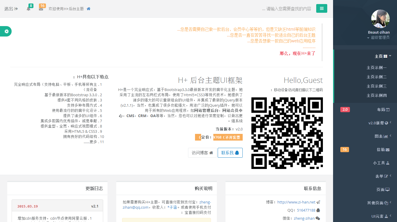 H+是一个完全响应式,基于Bootstrap3.3.4最新版本开发的扁平化主题,她采用了主流的左右两栏式布局,使用了Html5+CSS3等现代技术,她提供了诸多的强大的可以重新组合的UI组件,并集成了最新的jQuery版本(v2.1.1),当然,也集成了很多功能强大,用途广泛的jQuery插件,她可以用于所有的Web应用程序,如网站管理后台,网站会员中心,CMS,CRM,OA等等,当然,您也可以对她进行深度定制,以做出更强系统。